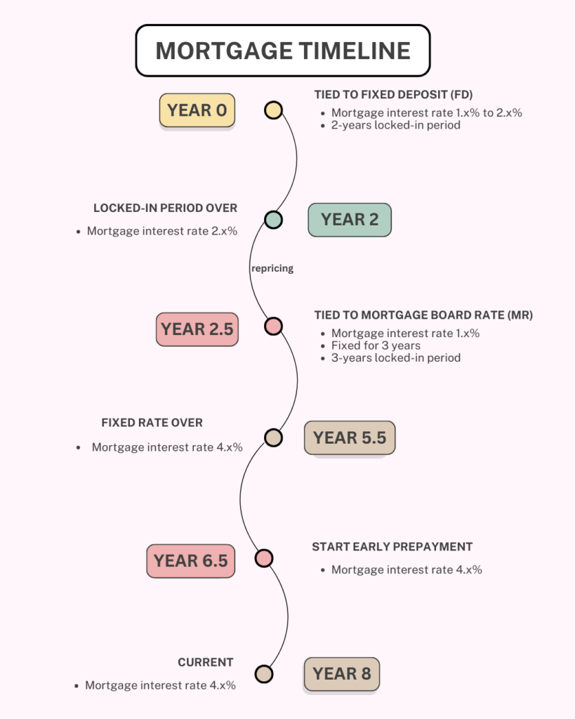 We started with a mortgage package tied to the Fixed Deposit (FD), with a 2-year lock-in period. Mortgage interest during this period was 1.x% to 2.x%. Once the 2-year lock-in period ended, the mortgage interest remained at over 2%.